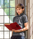 preshrunk 50% cotton/50% dryblend polyester pique • 6.5-oz. • Label type may vary as sewn-in labeling is transitioning to tagless heat-seal labeling • 20's air-jet yarn • moisture-wicking fabric • size extra-small side-seam construction • sizes small through extra-large tubular construction • contoured welt collar and cuffs • 2 color-matched buttons on a clean finished placket with reinforced bottom box • double-needle bottom hem • heat transfer label • CPSIA tracking label compliant • Sizes: XS-XL